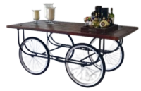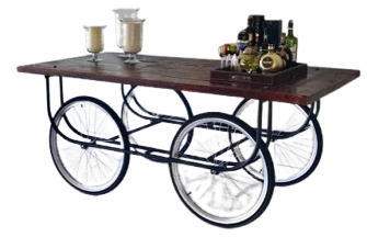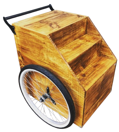 Mesacleta, confeccionada artesanalmente com base preta em aço e tampo em madeira maciça no tom marom. Possui 4 rodas funcionais, aro 26 com faixa branca de série!